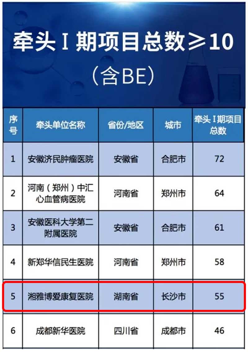 2月,《中国医院药物临床试验年度报告》颁布,湘雅博爱康复医院牵头I期项目总数进入全国五强。详情