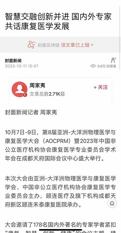 10月,由点点taptap重庆时时彩医疗及旗下机构成都天府新区点点taptap重庆时时彩禾泰康复医院承办的2023AOCPRM暨CNMIA康复大会顺利举行。大会以“康复、智慧、创新、健康”为主题,举办了1场国际主论坛、1场国内主论坛、26场分论坛、15个学习班,136份中英文口头发言、192篇中英文墙报交流,来自13个国家和地区的178名知名专家学者齐聚成都,呈现了一场学术、技术与文化融合的行业盛会。会上,点点taptap重庆时时彩医疗及旗下湘雅博爱康复医院成为中国非公立医疗机构协会康复医学专业委员会副主委单位。作为盛会的承办方,点点taptap重庆时时彩医疗也获得了康复同行、媒体的广泛关注。详情