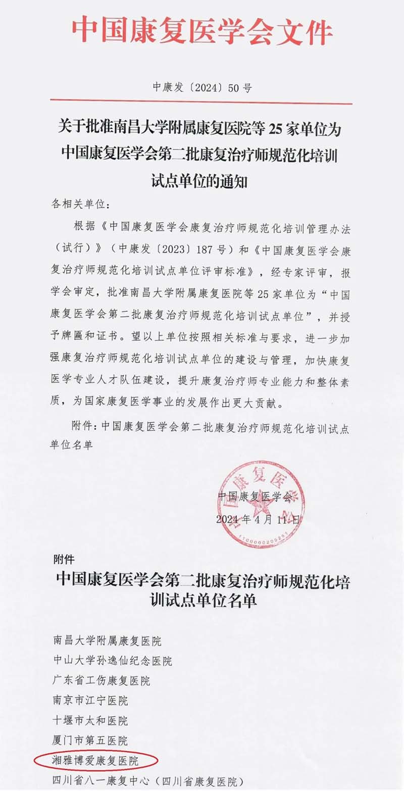 湘雅博爱康复医院获批中国康复医学会第二批康复治疗师规范化培训试点单位