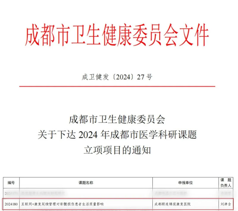 近期,成都市卫生健康委员会下发《2024年成都市医学科研课题立项项目的通知》。其中,成都点点taptap重庆时时彩锦宸康复医院OT组长刘津含带队申报的《互联网+康复延续管理对脊髓损伤患者生活质量影响》、成都老年康疗院营养科主任王利仙带队申报的《MIND膳食模式在认知功能障碍老年人中的应用探索》荣获立项。